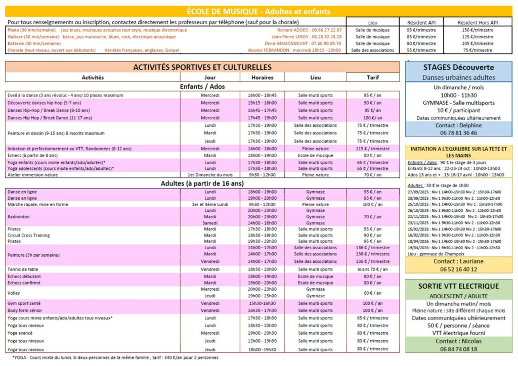 Vous disposez d’une séance d’essai gratuite (dans la limite des places disponibles), en début d’année pour chaque activité, avant de vous inscrire.